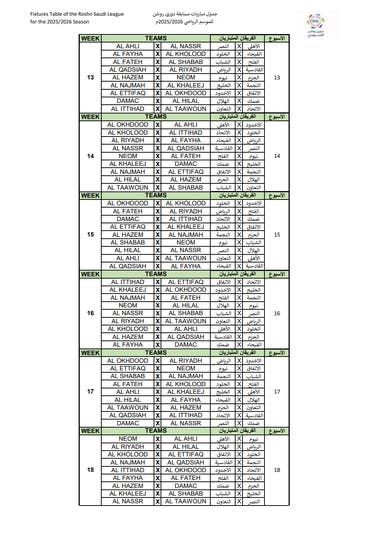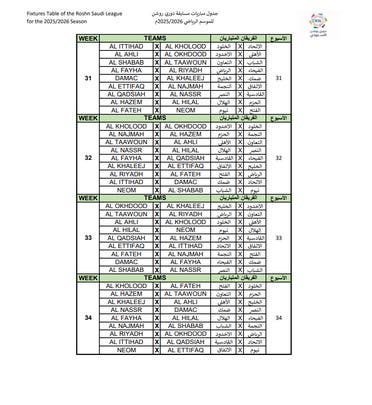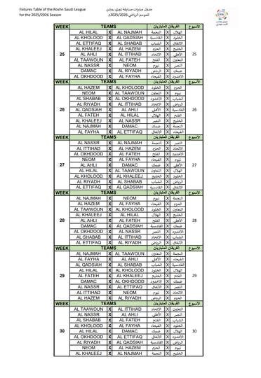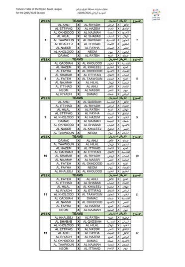 كشفت إدارة المسابقات في رابطة الدوري السعودي للمحترفين، يوم الثلاثاء، عن جدول مباريات دوري روشن السعودي للموسم الرياضي 2025-2026 الذي سينطلق يوم الخميس الموافق 28 أغسطس 2025.