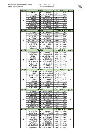 يبدأ الاتحاد، حامل اللقب، مشواره بمواجهة مضيفه الأخدود، فيما يستضيف الوصيف، الهلال، نظيره الرياض. ويحل النصر ضيفًا على التعاون، ويستضيف القادسية فريق النجمة، فيما يلتقي الأهلي نظيره نيوم.