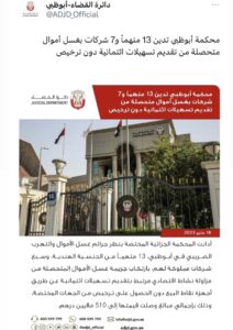 في إطار التزام دولة الإمارات العربية المتحدة بمواجهة جرائم غسل الأموال وكشفها وردعها للجرائم المالية، قضت المحكمة الجزائية المختصة بجرائم غسلالأموال والتهرب الضريبي في إمارة أبوظبي حضورياً على 4 متهمين، وغيابياً على بقية المتهمين الهاربين، بأحكام بالسجن تراوحت من 5 إلى 10 سنوات، ومصادرة الأموال المضبوطة، وإبعاد المدانين عن دولة الإمارات العربية عقب تنفيذ العقوبة، مع غرامةٍ تتراوح بين خمسة وعشرة ملايين درهم، وتغريم الشركاتالمدانة عشرة ملايين درهم.