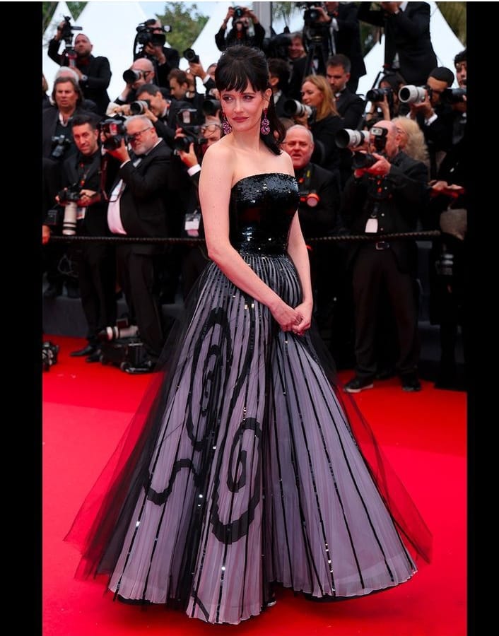 أما الجميلة إيفا غرين فارتدت ثوب الذكريات بلون رمادي من التول والمخمل بقصة رائعة واسعة التنورة مع تول مطرز فوق بطانة فاتحة اللون فظهر كأن الثوب عبارة عن ورقة لكتابة النوتات.