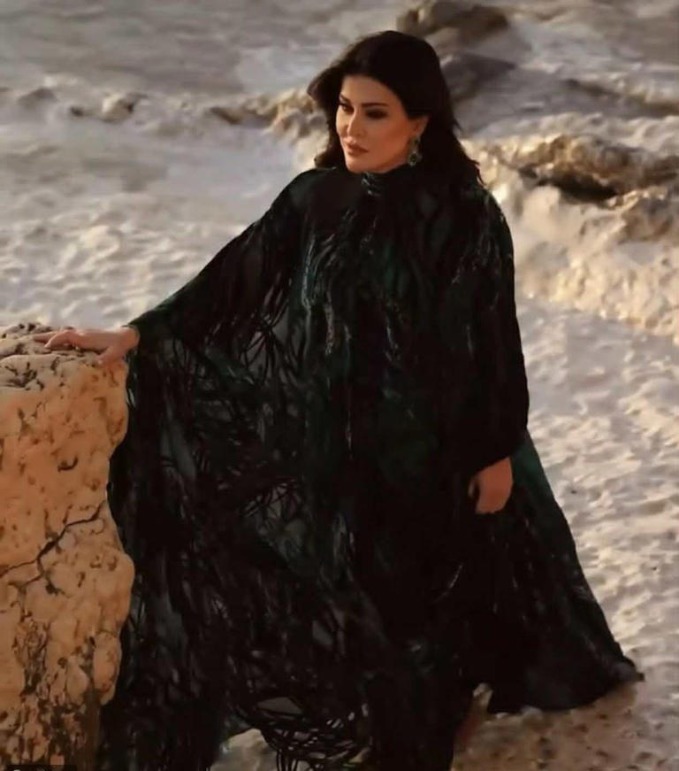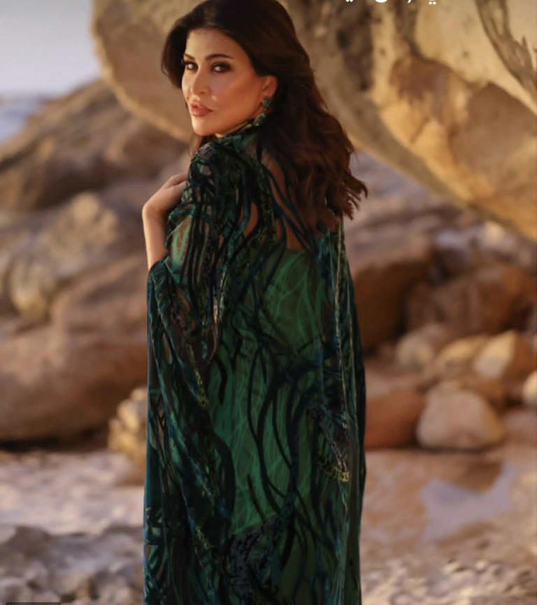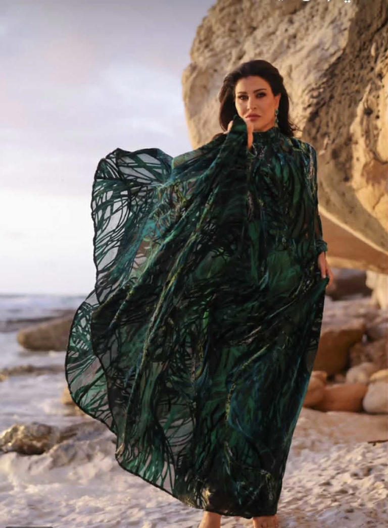 الفنانة جومانا مراد تتألق في أحدث جلسة تصوير لها بإطلالة درامية وساحرة على الشاطئ. فقد اختارت فستانًا طويلًا وفضفاضًا باللونين الأخضر والأسود، مع تسريحة شعر مموجة ومكياج قوي يبرز جمال عينيها.