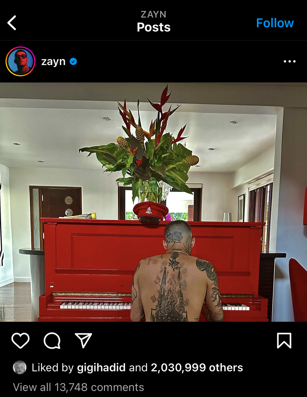 نشر النجم العالمي زين مالك صورة جديدة له على حسابه في موقع التواصل الاجتماعي “إنستغرام”، وهو يعزف على البيانو الخاص ويظهر خلالها الوشم الجديد الذي وضعه على ظهره.