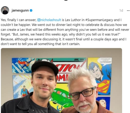 وكتب غان: “نعم، أخيراً أستطيع الإجابة، نيكولاس هولت هو ليكس لوثر في Superman Legacy، ولا يمكنني أن أكون أكثر سعادة. لقد خرجنا لتناول العشاء الليلة الماضية للاحتفال ومناقشة كيف يمكننا إظهار ليكس بشكل يكون مختلفاً عن أي شيء رأيتموه من قبل”.