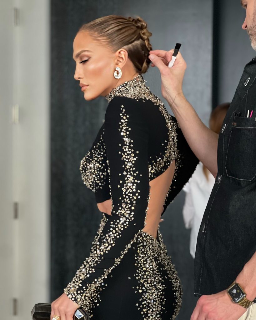 ارتدت نجمة “Hustlers” زيا مثيرا من قطعتين  من تصميم زهير مراد تضمن تنورة كاملة الطول وتوب مكمم موشى بالكامل مع ياقة عالية مزدانة بالبريق وخصر مفتوح واعتمدت تسريحة شعر مشدود إلى الخلف بينما ارتدت إيمي بدلة مخططة مع قميص رمادي وربطة عنق منقوشة وأقراط .