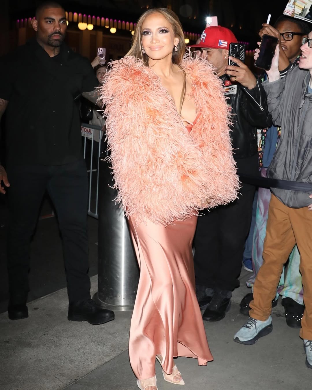 سارت جينيفر لوبيز وسط ومضات عدسات الباباراتزي بثقة أنثى تعرف كيف تواجه العالم بأناقتها وجرأتها، واختارت أكثر مفاتيح الموضة رواجاً والتي تعكس الترف وتعيد إلى الأذهان العصر الذهبي الهوليوودي.