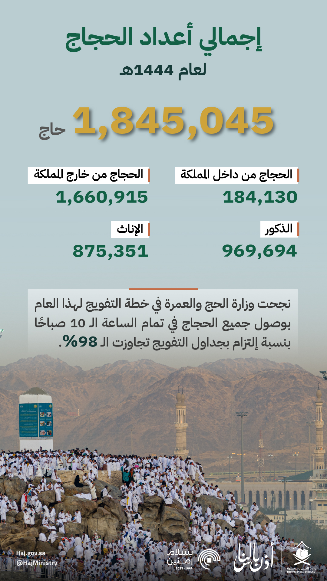ورصد بيانوزارة الحج والعمرة” 1,845,045 حاج هذا العام، ومن ضمنهم 857,351 إناثاً و969,694 ذكوراً. فيما توزع العدد الاجمالي للحجاج هذا العام بين  184,130 حاج من داخل المملكة العربية السعودية و1,660,915 من خارج المملكة.
