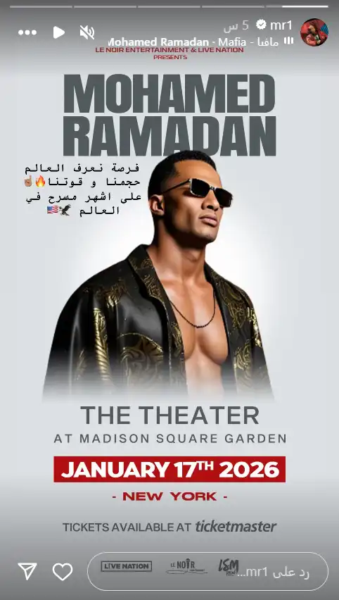 أعلن محمد رمضان عن إحيائه الحفل، يوم السبت 17 يناير/ كانون الثاني 2026، على مسرح The Theater الواقع في Madison Square Garden.