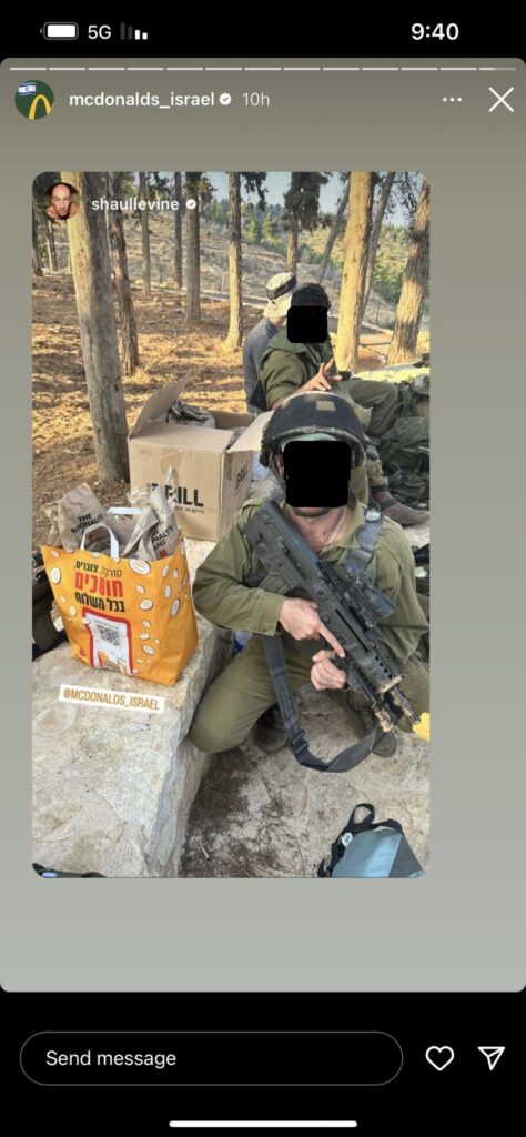 وتتصدر شركة ماكدونالدز تتصدر الآن محركات البحث على موقع فيسبوك، بعد أن تداول مستخدموها صورا للجيش الإسرائيلي مع وجبات ماكدونالدز، كما نشرت ماكدونالدز صورا لفعاليات توزيع تلك الوجبات.