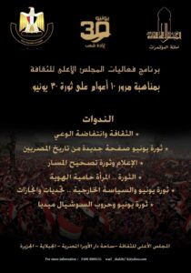 أما المجلس الأعلى للثقافة، بأمانة الدكتور هشام عزمي، يُنظم خلال شهر يوليو، مجموعة من الندوات، منها “الثقافة وانتفاضة الوعي، ثورة يونيو صفحة جديدة في تاريخ المصريين، الإعلام وثورة تصحيح المسار، الثورة… المرأة حامية الهوية، ثورة يونيو والسياسة الخارجية .. تحديات وإنجازات، ثورة يونيو وحروب السوشيال ميديا”.