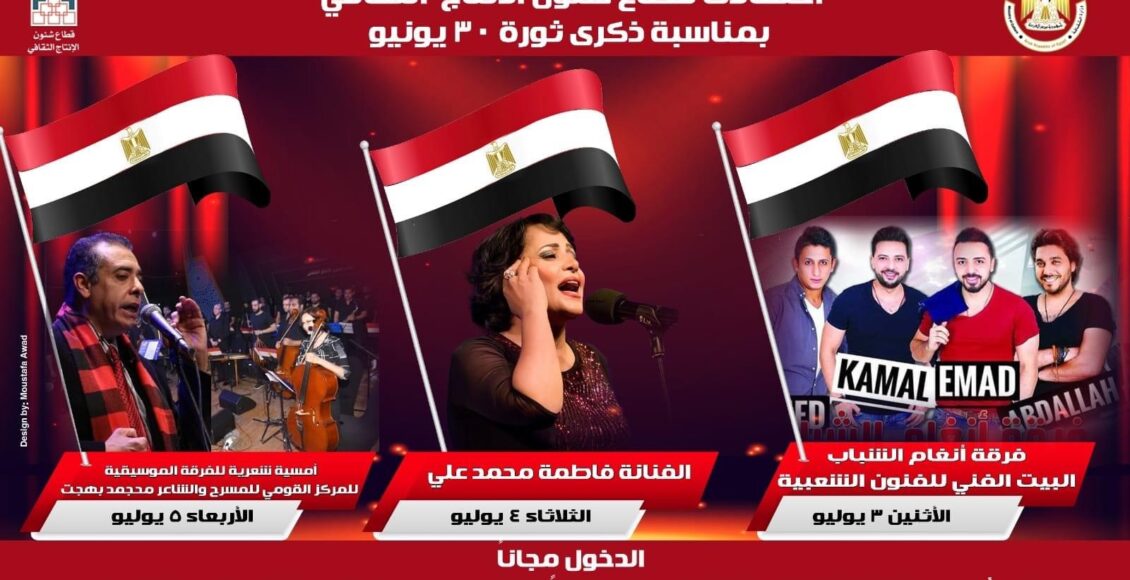 وزارة الثقافة المصرية تحتفل بثورة 30 يونيو بكرنفالات فنية وعروض موسيقية وورش بالقاهرة والمحافظات ومناطق بديل العشوائيات