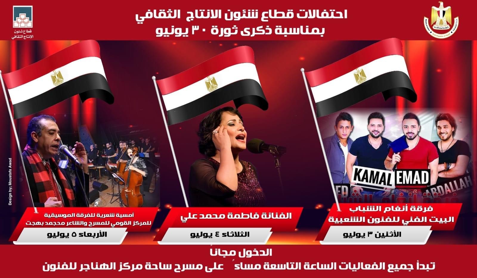 فيما يحتفل قطاع شؤون الإنتاج الثقافى، برئاسة المخرج خالد جلال، بذكرى ثورة ٣٠ يونيو، فى الفترة من ٣٠ يونيو الجاري حتى ٥ يوليو المُقبل، على مسرح ساحة مركز الهناجر للفنون، بساحة دار الأوبرا، بست حفلات موسيقية مجانية للجمهور ، تبدأ بحفل فريق كورال روح الشرق – جامعة عين شمس، ويحيي اليوم الثاني، عازف القانون صابر عبد الستار وفرقته الموسيقية .