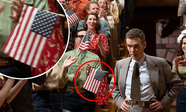 كتب آندي كريغ على شبكات التواصل الاجتماعي الخاصة به أنه أثناء مشاهدته لـOppenheimer، أدرك أن هناك خطأ فادحاً في أحد أكثر المشاهد شهرة وتمثيلاً في مسيرة روبرت جيه أوبنهايمر. على وجه التحديد، أشار هذا المستخدم إلى اللحظة التي يُلقي فيها العالم خطاباً للجمهور بعد نجاح القنبلة. يلوح الجمهور بعشرات الأعلام الأمريكية وهو يتحدث، لكن كريغ لاحظ وجود خلل تاريخي.