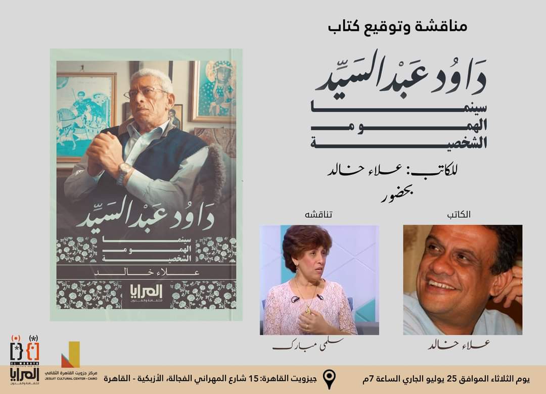 فى تمام السابعة من مساء الثلاثاء 25 يوليو الجاري تستضيف جمعية النهضة العلمية والثقافية “جزويت القاهرة” حفل إعلان وتوقيع كتاب “داود عبد السيد.. سينما الهموم الشخصية” للشاعر والروائي السكندري علاء خالد الصادر عن دار المرايا للثقافة والفنون .
