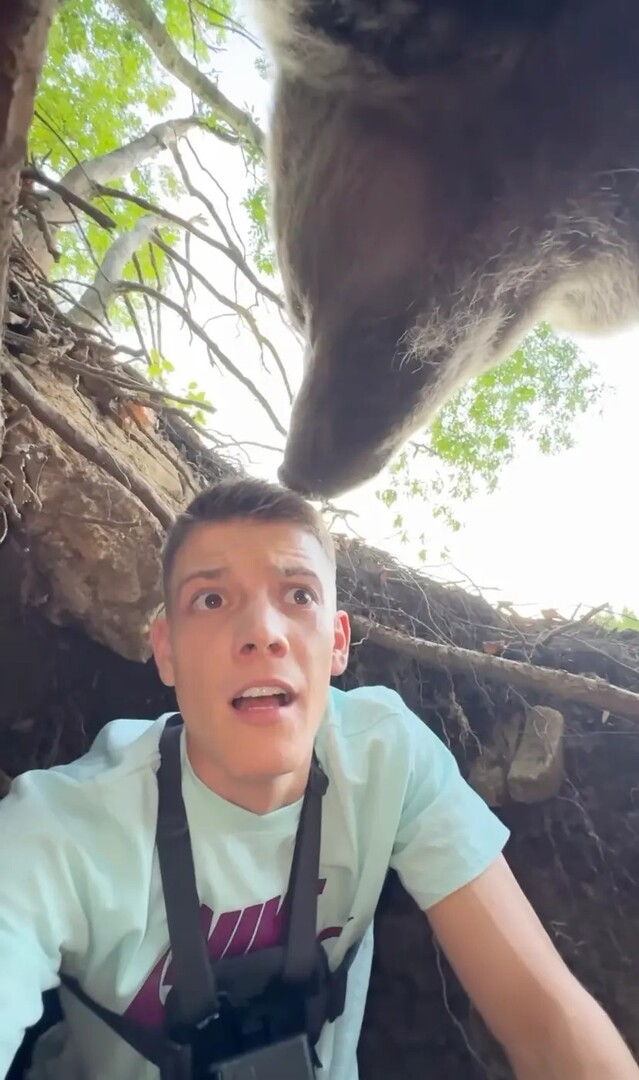 وشارك المؤثر ستيفان يانكوفيتش مقطعين من المواجهة الاستثنائية، حيث يظهر في الفيديو الأول وهو جالس داخل جحر دب وينظر إليه، بينما كان الحيوان المفترس يحاول قياس حجمه على ما يبدو مقارنة بفتحة الكهف الصغير.