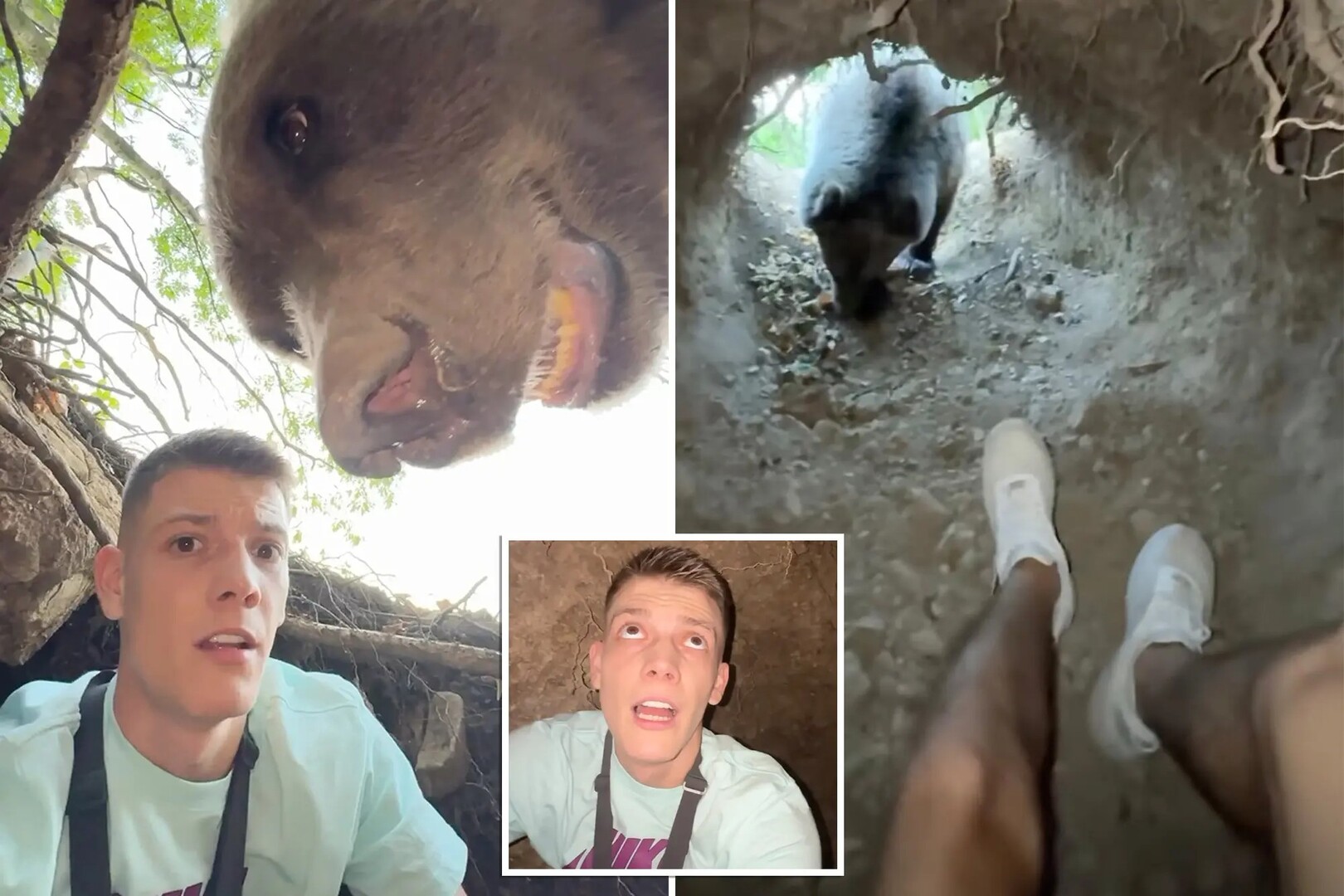 وشارك المؤثر ستيفان يانكوفيتش مقطعين من المواجهة الاستثنائية، حيث يظهر في الفيديو الأول وهو جالس داخل جحر دب وينظر إليه، بينما كان الحيوان المفترس يحاول قياس حجمه على ما يبدو مقارنة بفتحة الكهف الصغير.