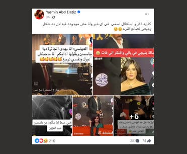 من خلال صفحتها الرسمية على موقع “فيسبوك”، أعربت ياسمين عن ضيقها من استغلال اسمها دون وجود سبب منطقي لذلك. وشاركت مجموعة من الصور ومقاطع الفيديو التي تم تداولها مؤخرًا، مشيرةً إلى محاولات البعض الربط بينها وبين العوضي في مناسبات مختلفة، رغم عدم وجود علاقة حالية بينهما.