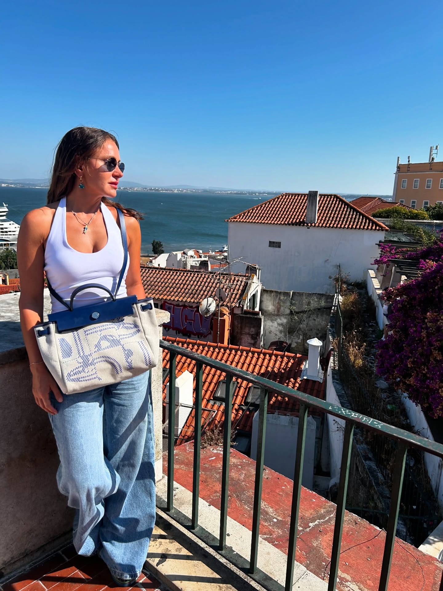 في شوارع لشبونة عاصمة البرتغال، اعتمدت ديمة قندلفت نمط الكاجوال المريح، حيث ارتدت سروالاً واسعاً من الدنيم Mom Jeans، نسّقته مع توب قصيرة بيضاء مكشوفة الكتفين بنمط “هالتر نك”، ومجوهرات من الذهب الأصفر المزيّن بأحجارٍ كريمة تركوازيّة اللون. وأكملت إطلالتها العصريّة بحقيبة فاخرة باللونين البيج العاجي والكحلي Herbag Zip Relief Brides de Gala Toile and Leather بقيمة 5,035$ من Hermes. هذه الإطلالة عكست مزيجاً مثالياً من الراحة والأناقة، خصوصاً مع نظارة شمسية عصرية وحذاء مسطّح.