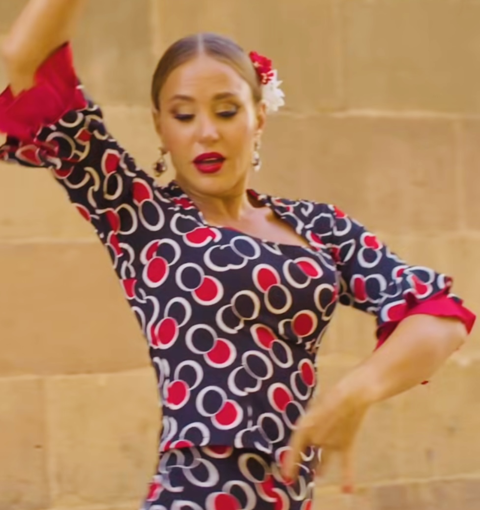 استحضرت ديمة سحر التراث الإسباني العريق بفستان فلامنكو أيقوني أسود اللون ومطبّع بدوائر كبيرة باللونين الأحمر والأسود مُبرزة باللون بالأبيض، وزيّنت أذنيها بقرطين مرصّعين بأحجار كريستاليّة شفّافة وحمراء، ووضعت وردتين كبيرتين في شعرها المرفوع بنمط الشينيون، لتبدو كأنها جزء من لوحة أندلسية نابضة بالحياة.