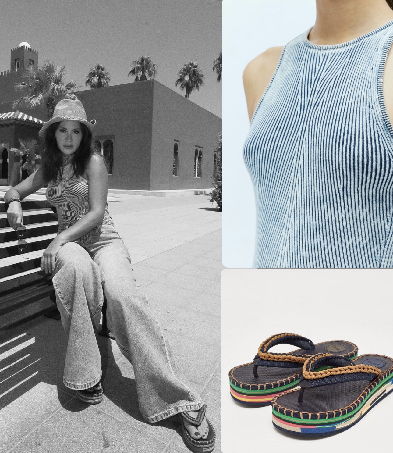 خلال استكشافها المدينة، اختارت النجمة السوريّة مرّة ثانيّة سروال الدنيم الأزرق الواسع المريح ونسّقته مع “تانك” مخططة باللونين الكحلي والأبيض ومكشوفة الكتفين بنمط “هالتر نك” M-Tansy Tank Bodysuit من علامة Diesel، واعتمرت قبّعة من الرافيا بلون بيج حيادي. كذلك، وضعت نظّارة شمسيّة داكنة، وتزيّنت بمجوهرات وحليّ عصريّة، وانتعلت شبشباً مريحاً Multicolor Fabric and Rubber Thon Sandals من علامة Chloe، لتجسّد الإطلالة العصرية التي تلائم السفر والتنقل في شوارع المدينة تحت أشعة الشمس.
