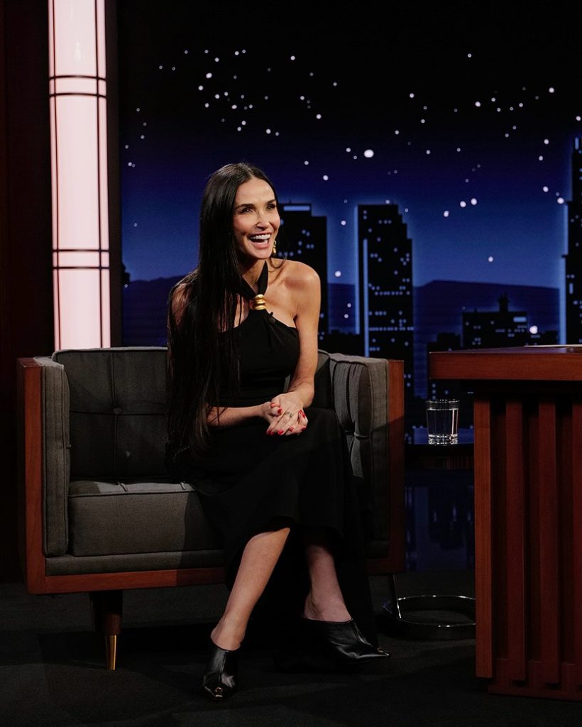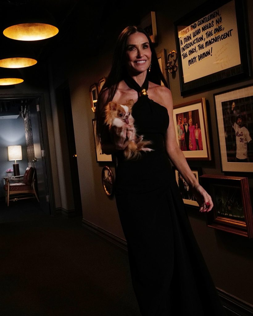 قادرة النجمة ديمي مور 62 عاما أن تلفت الأنظار بأناقتها وروحها الصاخبة فهي طالما حضرت المناسبات ومعها كلبها الصغير بيلاف .جاءت الممثلة ، التي تستعد لجائزة الأوسكار عن دورها في The Substance ،والتي نالت مؤخراً جائزة غولدن غولب عن الفيلم نفسه إلى استوديو Jimmy Kimmel Live وهي ترتدي مظهرا أنيقا ومذهبا وتحمل بين يديها كلبها الصغير بيلاف.