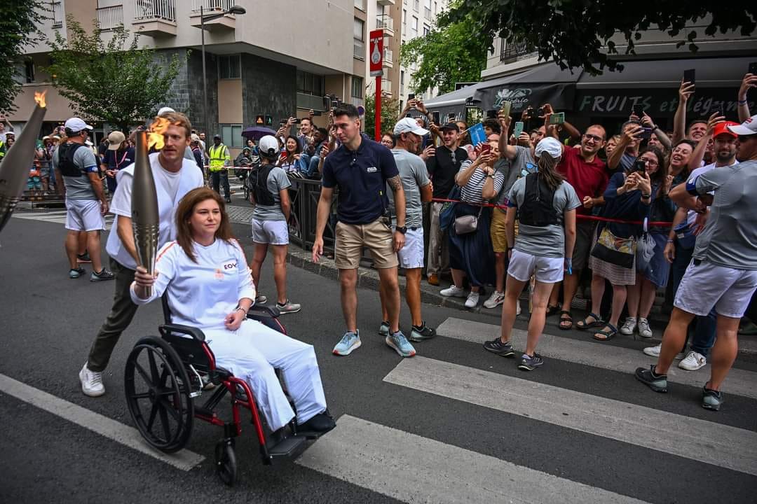 في يوليو/تموز الماضي، حملت الشعلة الأولمبية على كرسي متحرك، مع زملاء لها من وكالة الأنباء الفرنسية (AFP)، تكريمًا للصحفيين الذين أصيبوا أو قتلوا حول العالم.