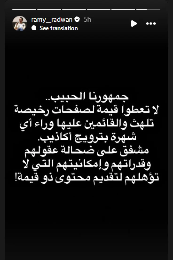 كتب رامي رضوان عبر خاصية القصص القصيرة المُلحقة بحسابه الخاص في إنستغرام: “جمهورنا الحبيب… أرجو ألا تعطوا أي قيمة لصفحات رخيصة ورديئة، يلهث القائمون عليها خلف الشهرة بترويج الأكاذيب، أشفق على ضحالة عقولهم وقدراتهم، وإمكاناتهم التي لا تؤهّلهم لتقديم محتوى له أي قيمة”.