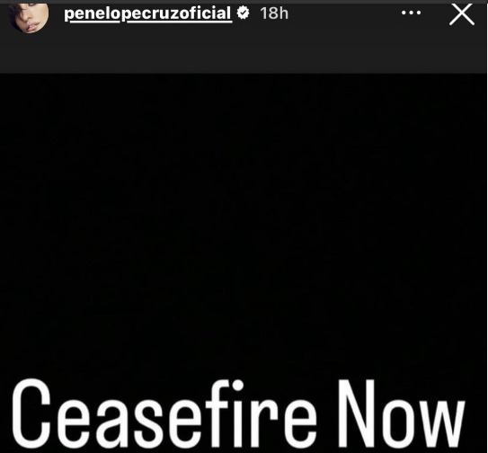 دعت الممثلة العالمية بينلوبى كروز الى وقف لإطلاق النار على غزة ، وذلك عبر خاصية الستوري من خلال حسابها على موقع إنستغرام، في موقف جديد تضامناً مع القضية الفلسطينية.