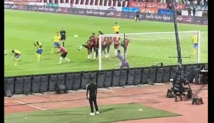 وخلال لقاء النصر السعودي مع الرائد، نفذ رونالدو ركلة حرة، أخطأت المرمى، لكنها ارتطمت بقوة في رأس المسؤول عن التصوير بالرافعة خلف المرمى.