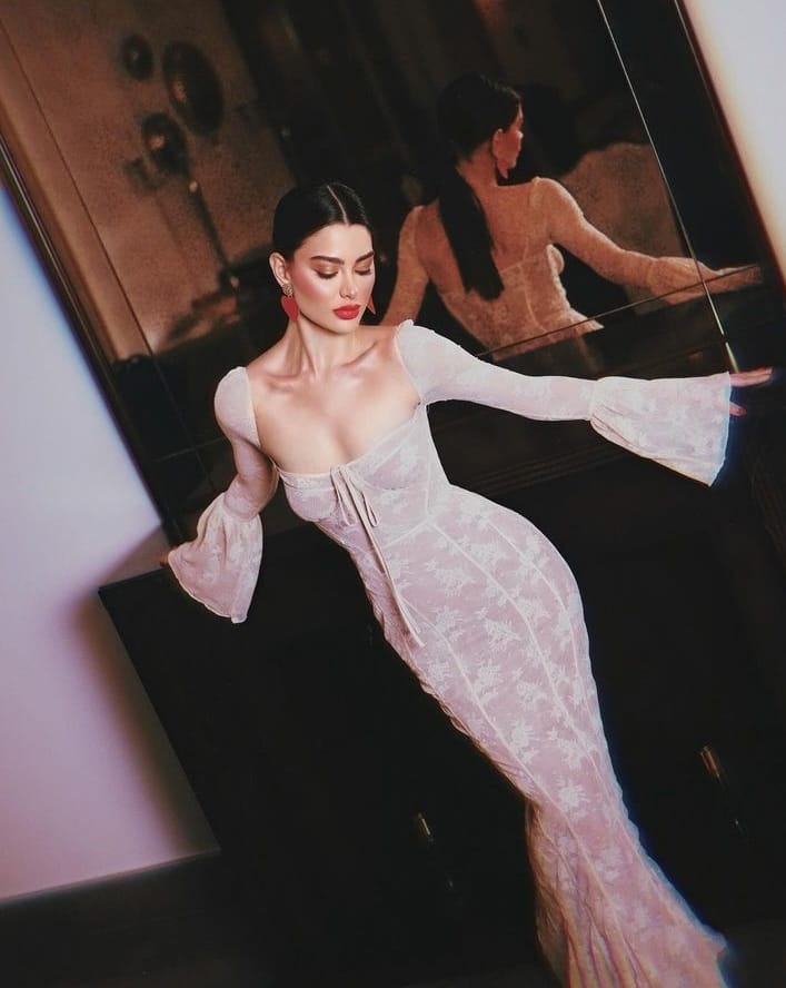 تقدم روان بن حسين إطلالتها كاملة حتى ولو كان اللباس بسيطاً. في جلسة تصوير خاصة لمجموعة luxurio الجديدة. قدمت ثوب vintage بلون الشامبانيا. مكور الصدر بياقة مفتوحة على شكل مربع. وأكمام طويلة مزدانة بالكشكش.