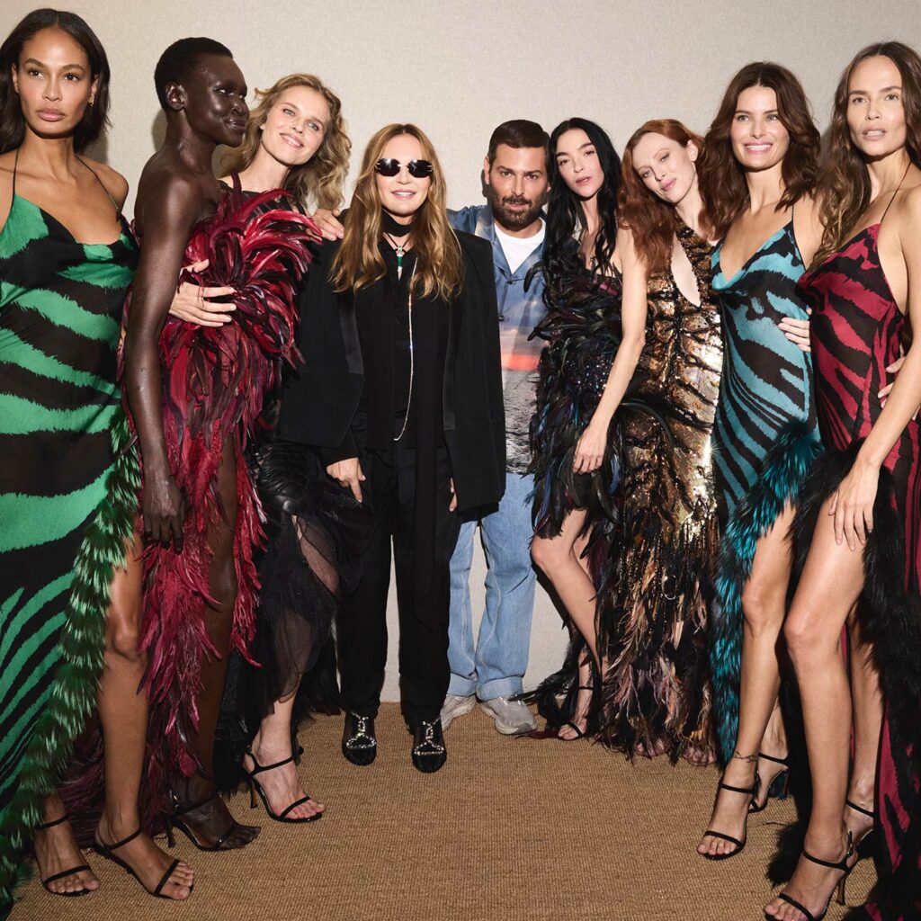 واحتفاءً بذكرى عبقرية روبرتو كافالي الإبداعية ، جاءت لفتة تكريم لذكرى العبقري الذي رحل من قبل عارضات أزياء طالما تعاون معهن مثل إيفا هيرزيغوفا وجوان سمولز وإيزابيلي فونتانا وناتاشا بولي ومارياكارلا بوسكونو وكارين إلسون وأليك، سبع إطلالات أرشيفية مذهلة من عام 2000 ، بما في ذلك فساتين زيبرا زل.