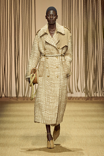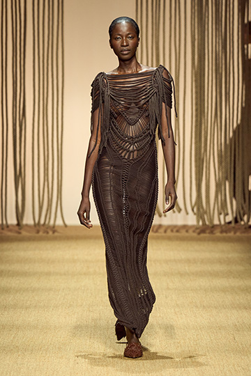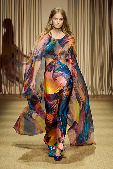 جاء العرض كحكاية متوسطية تحمل تصاميم لحورية بحر. تم تطريز الشباك على المعاطف، بينما تتحرك الفساتين المنسدلة والسراويل الفضفاضة بأناقة غير رسمية. يلفت غياب المطبوعات في هذه الإطلالات الأولية مع الانتباه إلى الشكل والبنية ، حيث تم تصميم كل قطعة بعناية لإثارة الشعور بالراحة.