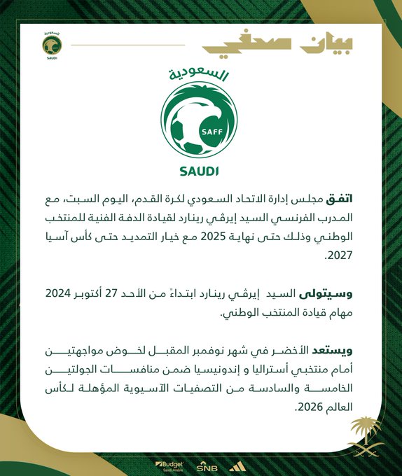 رونار، الذي غادر المنتخب السعودي بطريقة جدلية في أغسطس الماضي، كان قد انتقل لتدريب منتخب سيدات فرنسا. خلال فترة قيادته السابقة، قاد المنتخب للتأهل إلى كأس العالم 2022، حيث حقق فوزاً تاريخياً على الأرجنتين (2-1) في المباراة الافتتاحية.