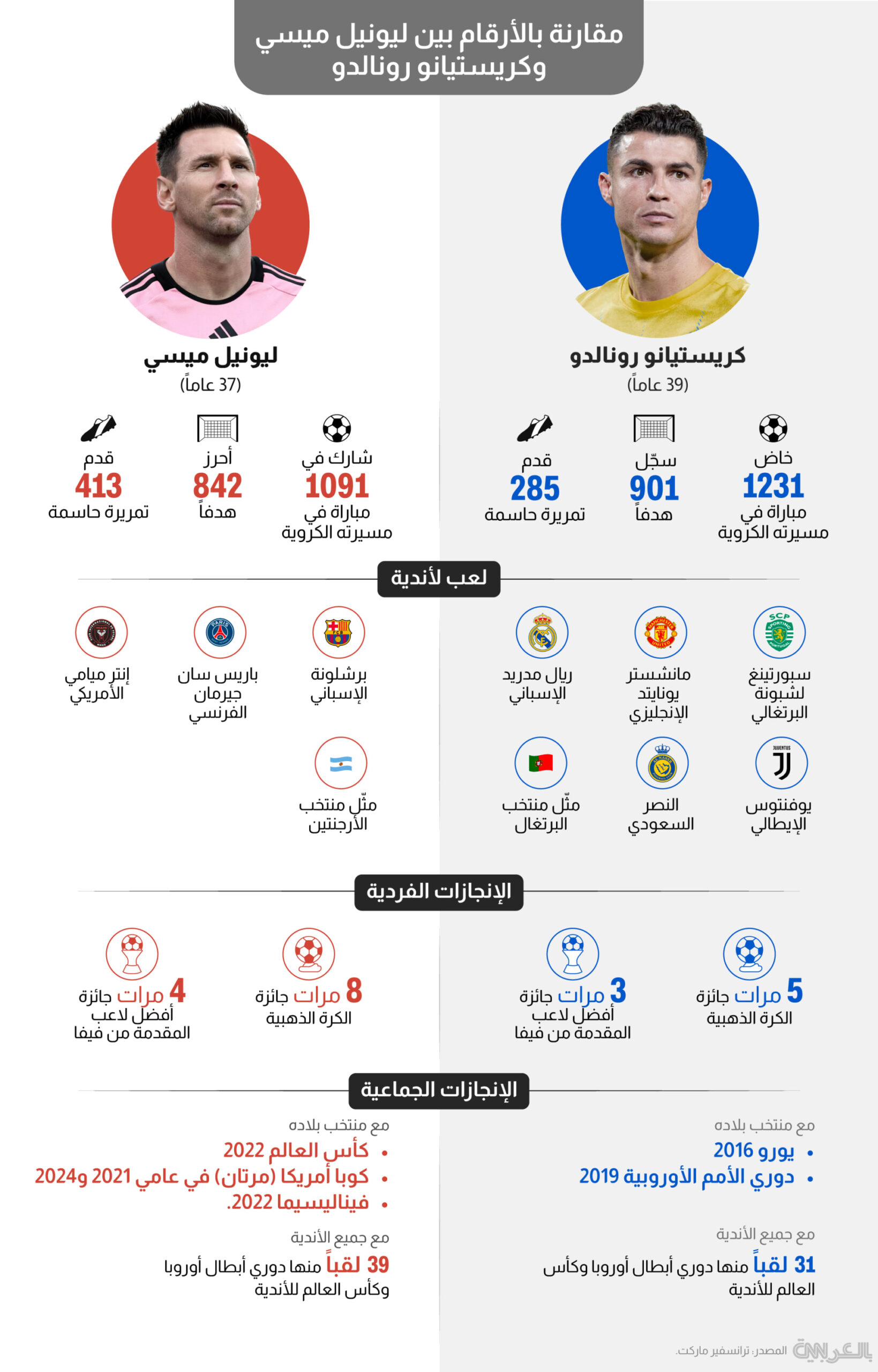 نجح رونالدو، الذي يكبر  ميسي بعامين، في أماكن مختلفة، بدءاً من نادي سبورتينغ لشبونة البرتغالي وحتّى نادي النصر السعودي، إذ تمكّن من تحقيق إنجازات فردية وجماعية في كلّ دولة لعب فيها.