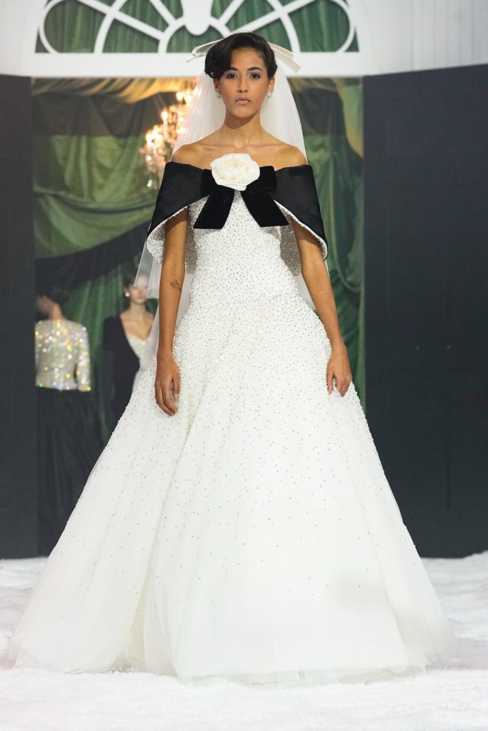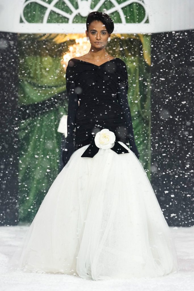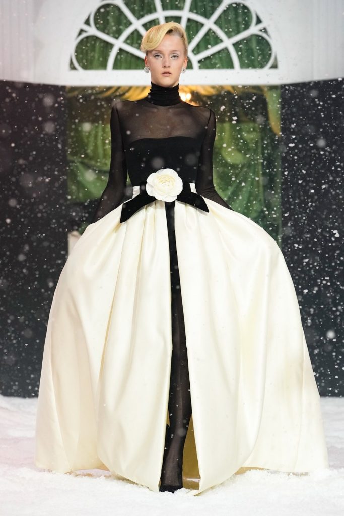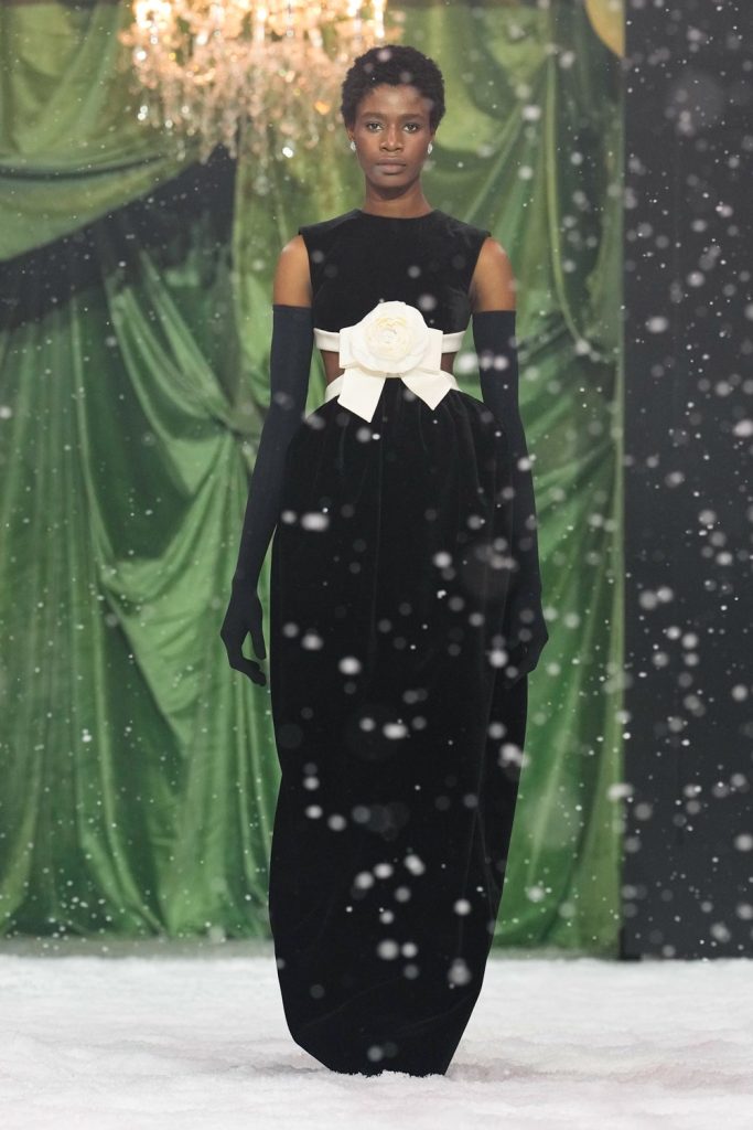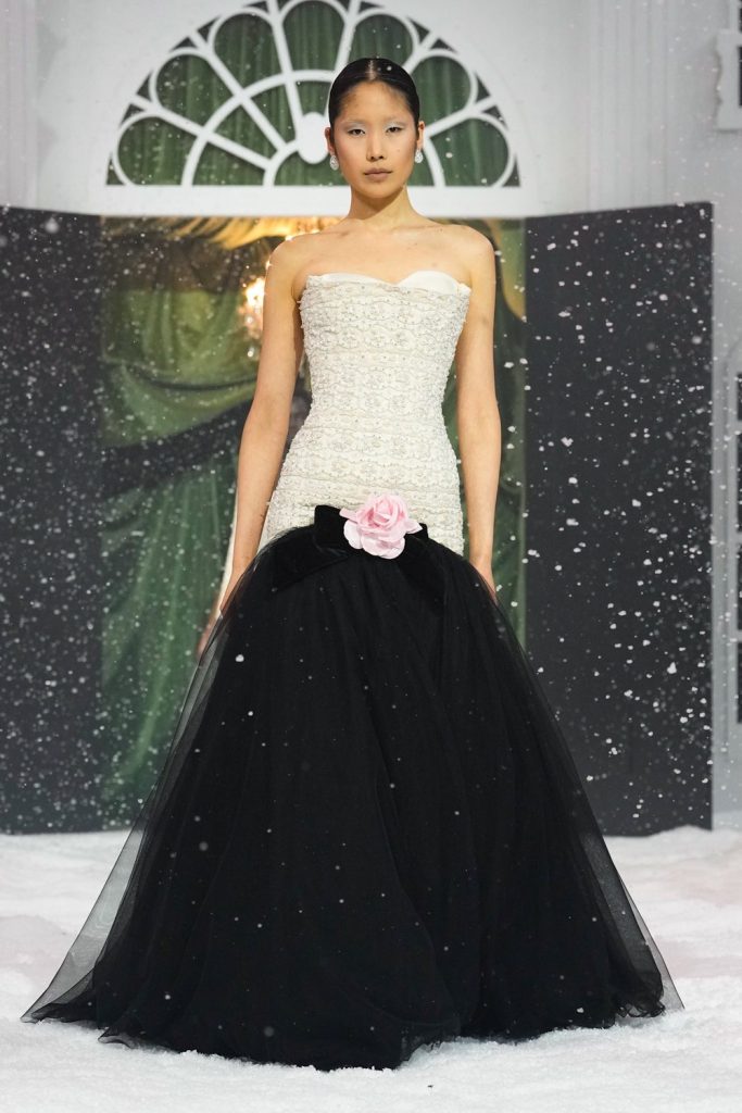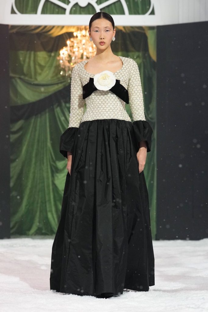 سيطر الحرير أحادي اللون بين الأبيض والأسود والمخمل الغني والفساتين المزخرفة بأناقة على المجموعة ، مما يدل على إتقان كوين للتفاصيل والتخريج القديم.