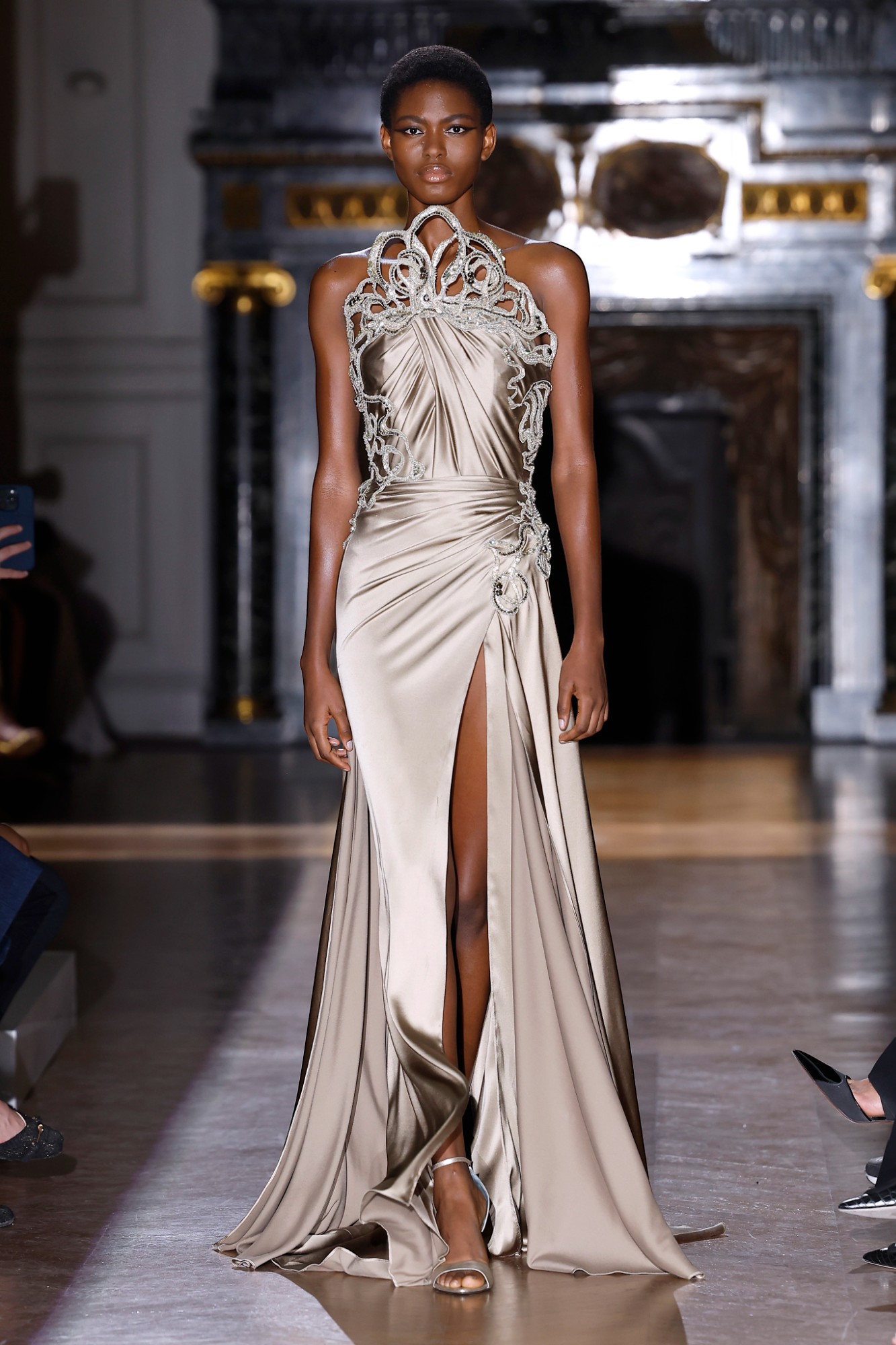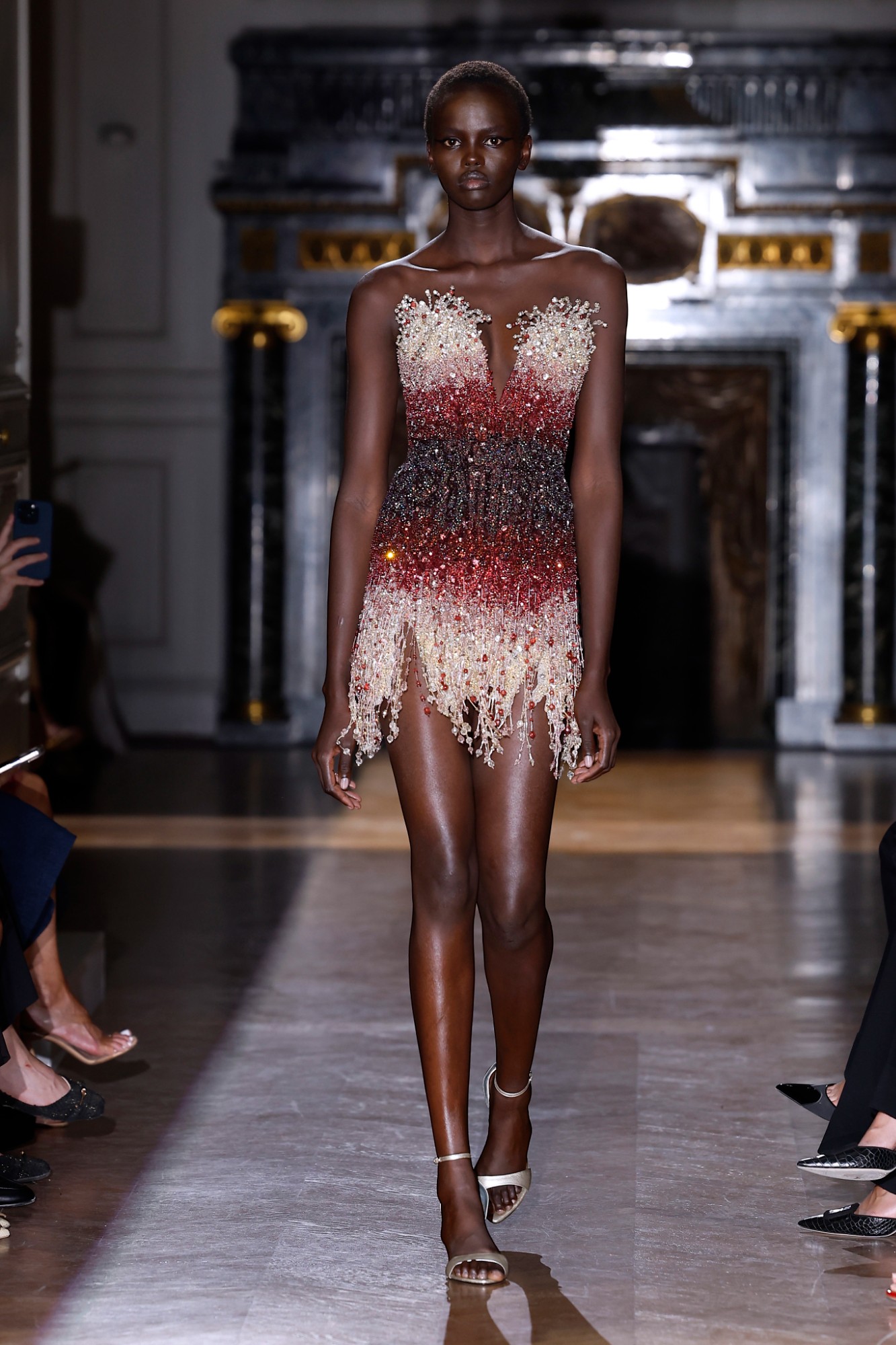 يتصاعد الدخان ثلاثي الأبعاد من الأسفل إلى الأعلى على ثوب بأكتاف مرتفعة، ينبعث من سيجارة تأملية أو نار بالكاد يتم ترويضها. هنا وهناك، يصمم زهير مراد آثار الرصاص، والمرايا المحطمة، وبصمات الأصابع الكبيرة التي تنقش أخاديدها التوقيع الذي لا يمحى للشخصية الأنثوية المثالية التي تشارك، وتنظم، وتنجز، وتعمل ضد النسيان. تتشابك البلورات مع شبكات عصبية معقودة كما لو أنها تطرد التوتر. ولكن في كل مكان أيضًا، تحاكي اللآلئ فقاعات الشمبانيا، متلألئة حول دموع مبهجة وغير منتظمة.