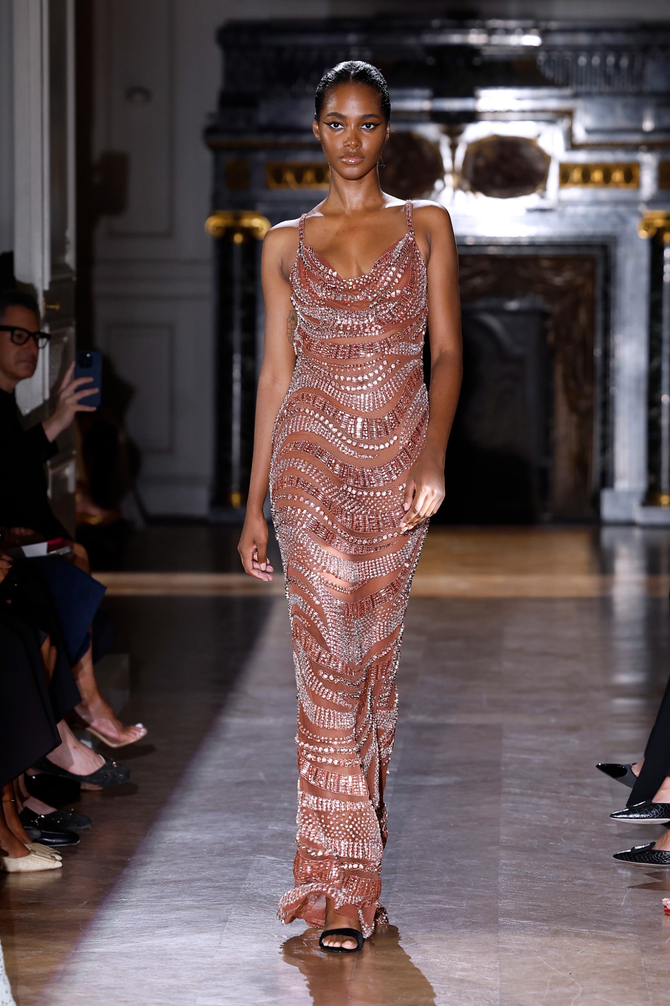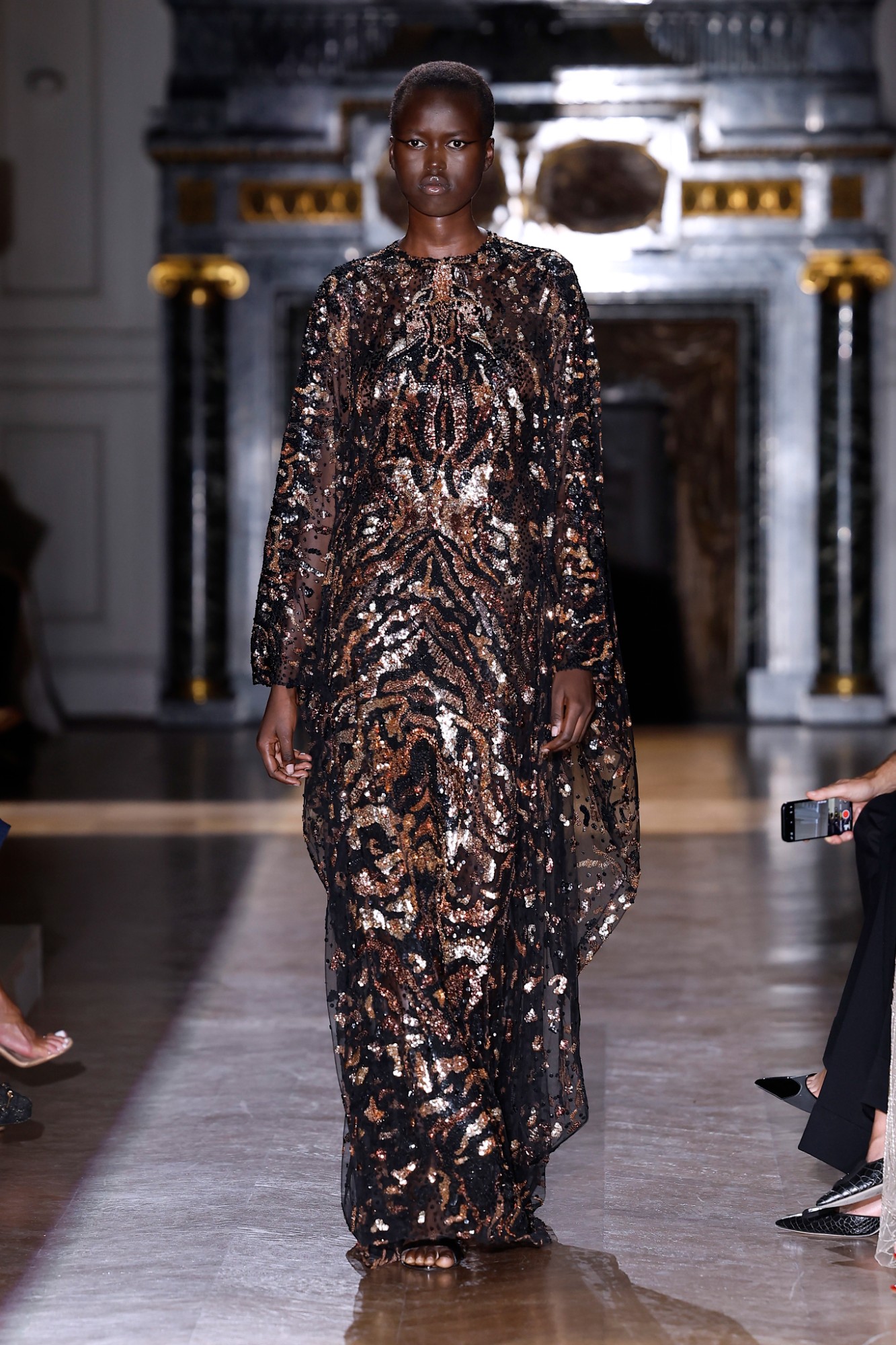 يتم التعبير عن هذه المرونة من خلال آثار ألم ووجع الماضي، وترتفع إلى تطريزات. تجمع الغرز المصنوعة من الكريستالات المتلألئة بين حواف الفستان المشقوق والندبات والشقوق التي تدعو الضوء إلى الداخل. تعمل طبعة الحيوانات المعاد تصورها على رفع مستوى الحس، وهو تمويه حسي يعيد كتابة غريزة البقاء في شكل أنثوي مباشرة على الجلد.