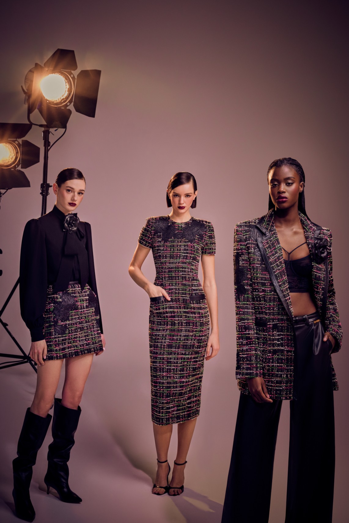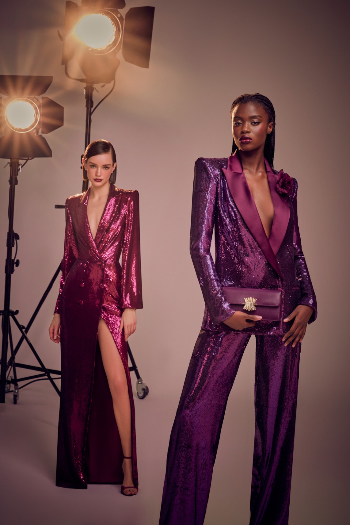 يتجلى الاندماج بين الذكورة والأنوثة في مجموعات جريئة، حيث تمزج البدلات المنظمة مع الورود المطرزة. الترتر تزدهر في أنماط متنوعة.
