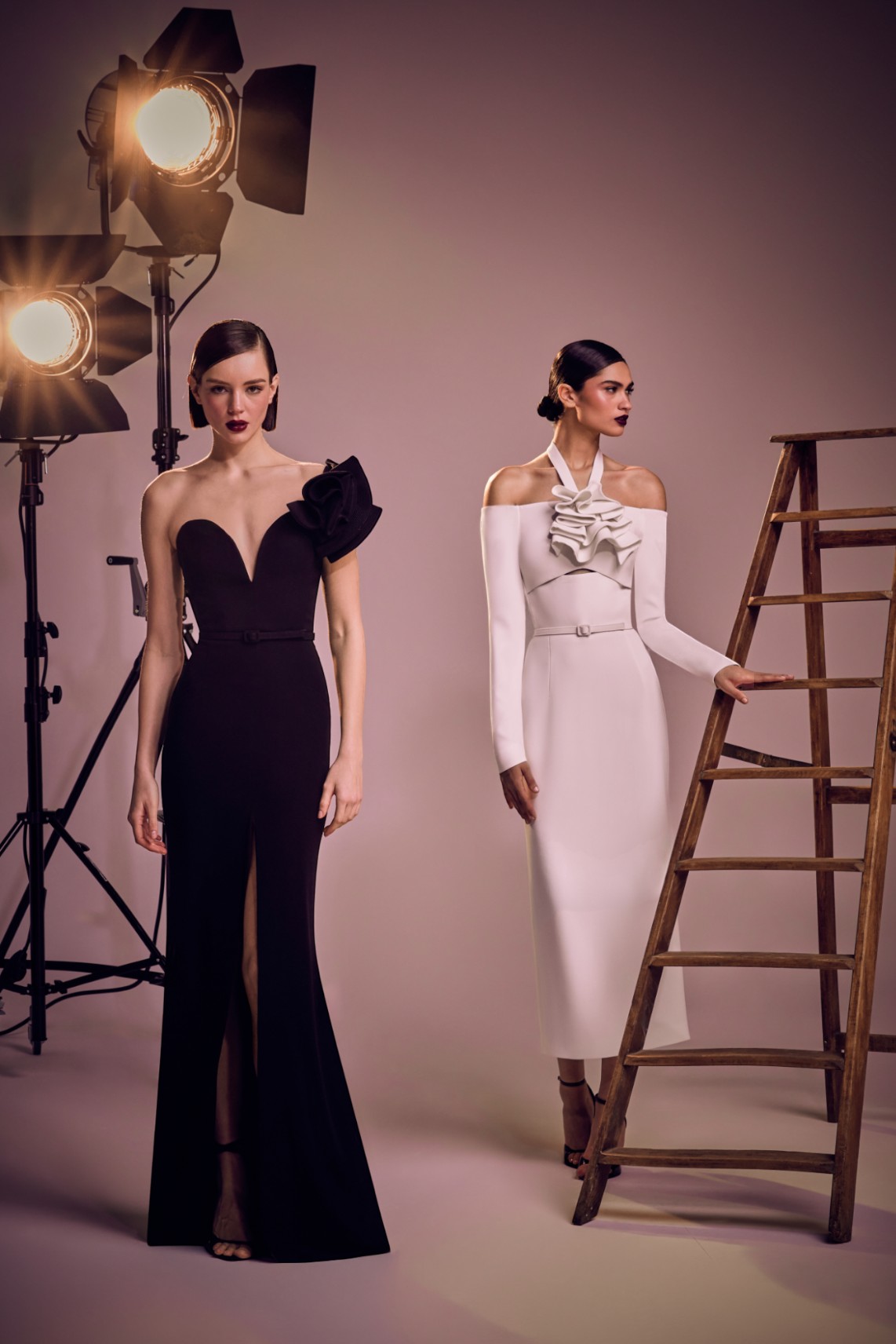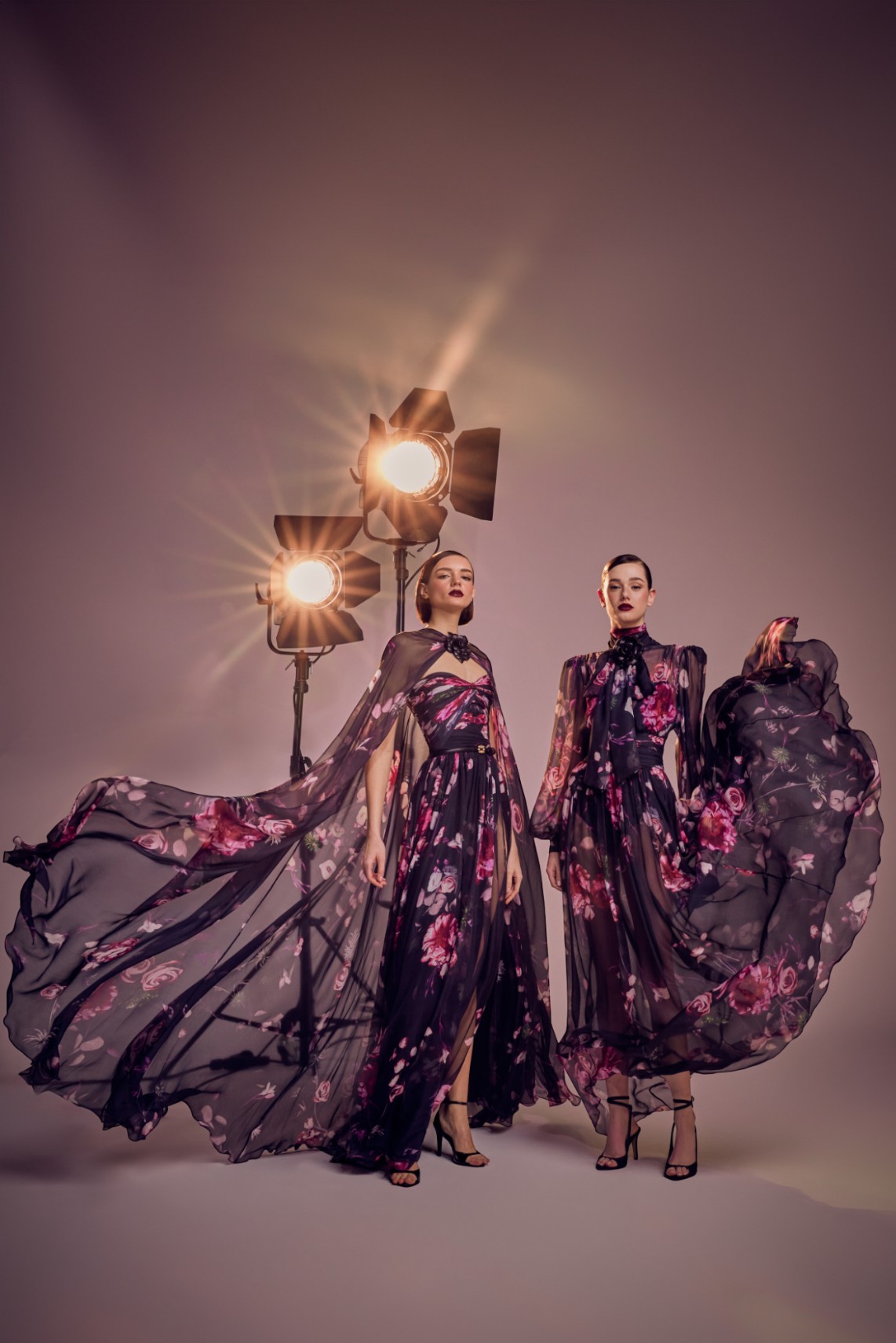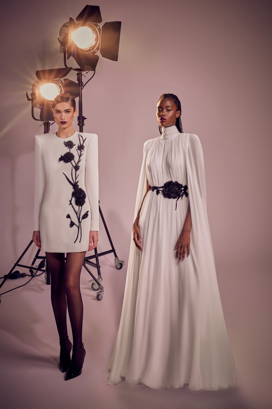 تلاعب بين الصلابة والانسيابية يزيّن الإطلالات بتفاصيل فاخرة. تحدد النغمة ببهجة فريدة من الصور الظلية الفخمة. البساطة والرقي ينظران إلى بعضهما البعض على النقيض من ذلك، مع صور صغيرة مضاءة بالزهور المرصعة بالترتر.