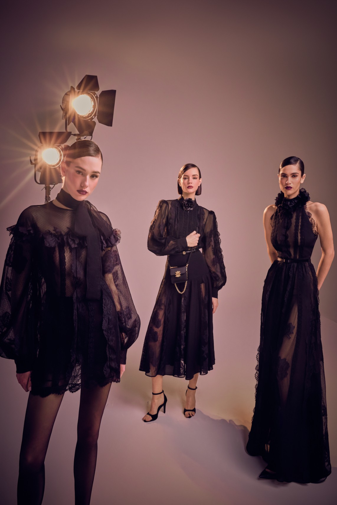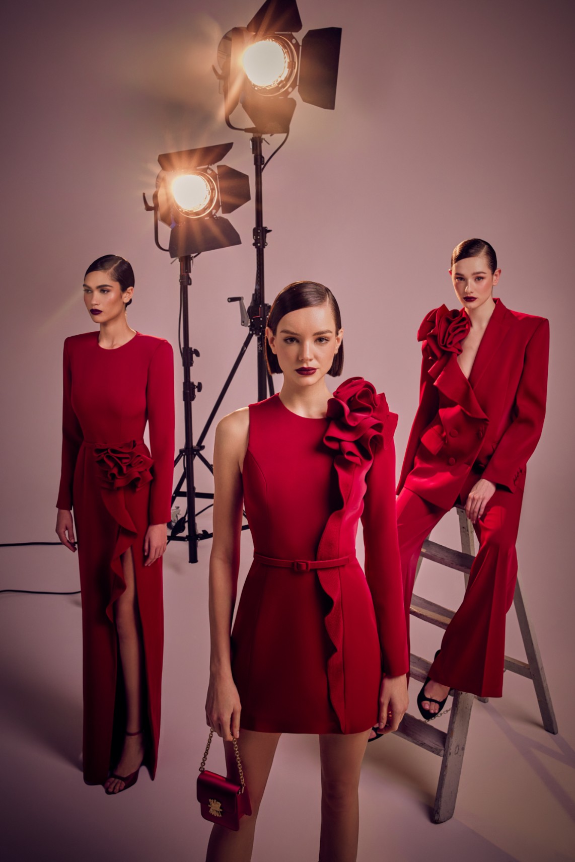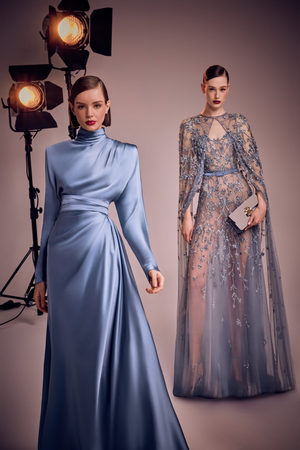 تلاعب بين الصلابة والانسيابية يزيّن الإطلالات بتفاصيل فاخرة. تحدد النغمة ببهجة فريدة من الصور الظلية الفخمة. البساطة والرقي ينظران إلى بعضهما البعض على النقيض من ذلك، مع صور صغيرة مضاءة بالزهور المرصعة بالترتر.