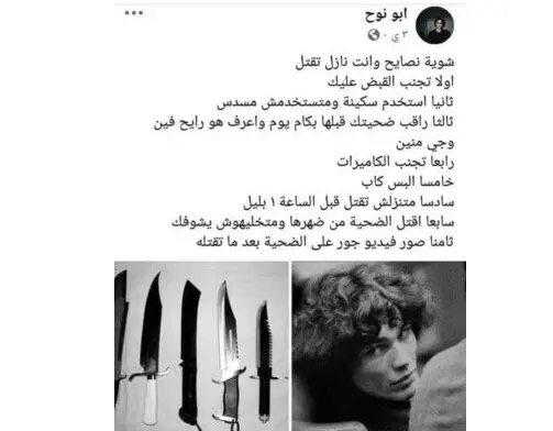 كما ظهر سفاح القطط وهو يحرض على القتل ويعطي نصائح لارتكاب الجريمة، ودعم ذلك بفيديوهات لقتل وتعذيب القطط، وإغراقها في مياه ساخنة وشنقها، كما بدت القطط وهي تتدلى من حبال معلقة.علاوة على ذلك، قدم صاحب الحساب نصائح للمجرمين عن آليات مختلفة تمنع كشفهم وسقوطهم في قبضة الأمن.