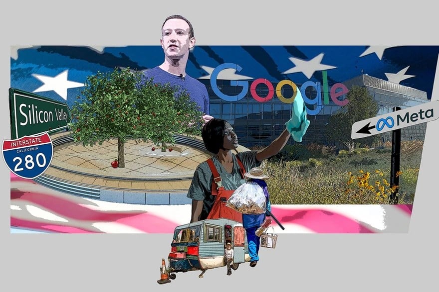 فعلى الطريق الممتدة بالقرب من جامعة ستانفورد، العريقة والمُكلفة، يُركن صفّ طويل من المنازل المتنقّلة التي تأوي في المساء عائلات بأكملها، وذلك لأن ميزانياتها لا تسمح لها باستئجار منزل أو شقة في هذه المنطقة باهظة الإيجارات. وتجني هذه العائلات قوتها من بيع وجبات الطعام في الحرم الجامعي، أو العمل في السباكة، أو في وظائف بشركات التكنولوجيا. والعديد منها هي عائلات مهاجرة إلى الولايات المتحدة، ولا تُشبه في هيئتها مارك زوكربيرغ أو ستيف جوبز.