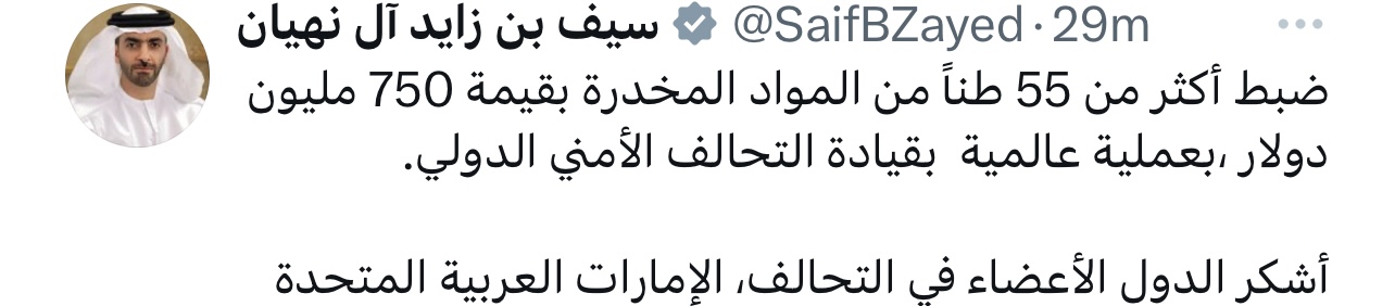 كشف الفريق سمو الشيخ سيف بن زايد آل نهيان، نائب رئيس مجلس الوزراء وزير الداخلية في دولة الإمارات العربية المتحدة، قبل دقائق عبر حسابه الرسمي في في تويتر، عن ضبط أكثر من 55 طناً من المواد المخدرة بقيمة 750 مليون دولار، في عملية عالمية بقيادة التحالف الأمني الدولي.