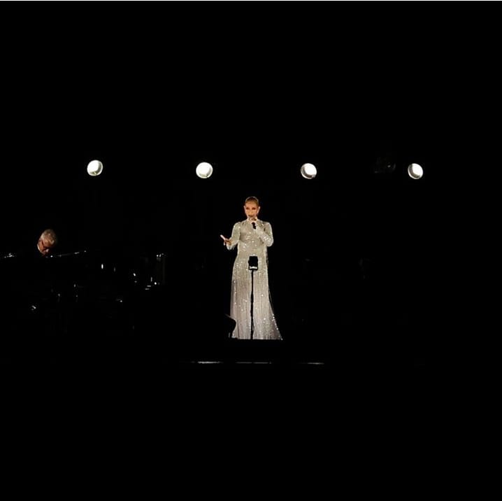 طلت ديون كزهرة تفوح صوتاً وغناءً في ليل باريس الذي تابعه العالم الأجمع وديون تغني بوقفة لا يشوبها شيء. بل اعتمرت الأبيض الوهاج من تصاميم كريستين ديور ولمعت كنجمة تحت البرج العظيم بذاك الثوب الأبيض ذات الياقة العالية والمكمم وخيوط الوهج تتدلى من حوافيه ، تحكي حكاية صمود وتجلي. ظهور مليء بالبهرجة والعظمة. بين أضواء الليزر وسيدة الصوت تبعث شجوها غناء باللغة الفرنسية والإنكليزية. تزينت بأقراط ماسية والشعر المضبوب نحو الخلف بتسريحة بسيطة. والعيون المدخنة كسيدة الأسرار العميقة.