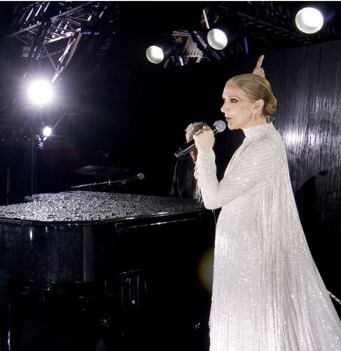 طلت النجمة الأشهر في زماننا بالأبيض البراق المتوهج كشمس في ليل باريس خلال افتتاح الأولمبياد تحت المطر تغني للعالم كله ليسمع صوت الرقة في مجابهة الخوف وتعلن صرخة حب توحد الكون في حنجرة تأبى التنحي.