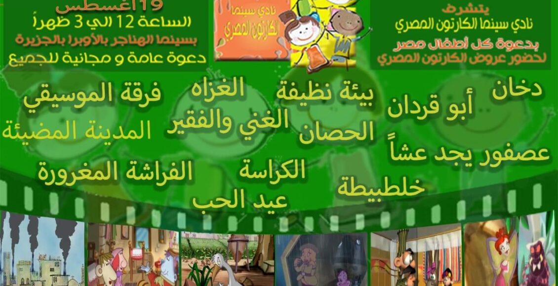 تستضيف قاعة سينما الهناجر التابعة لقطاع صندوق التنمية الثقافية نادى سينما الكارتون المصري فى تمام الثانية عشر ظهر غدٍ السبت 19 أغسطس مجموعة مختارة من الكارتون المصرى التى تعكس عدد من القيم وتؤكد على الهوية المصرية منها: “دخان” ، “ابو قردان” ، “بيئة نظيفة” ، ” الغزاة” ، ” فرقة الموسيقى ” ، عصفور يجد عشاً” ، ” الحصان” ، “الغني والفقير” ، ” المدينة المضيئة” ، “خلطبيطه” ، ” الكراسة” ، ” الفراشة المغرورة” ، و ” عيد الحب”.