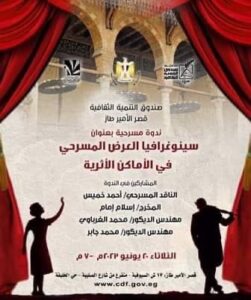 ندوته الأسبوعية عن عنوان ” سينوغرافيا العرض المسرحى في الأماكن الأثرية ” .