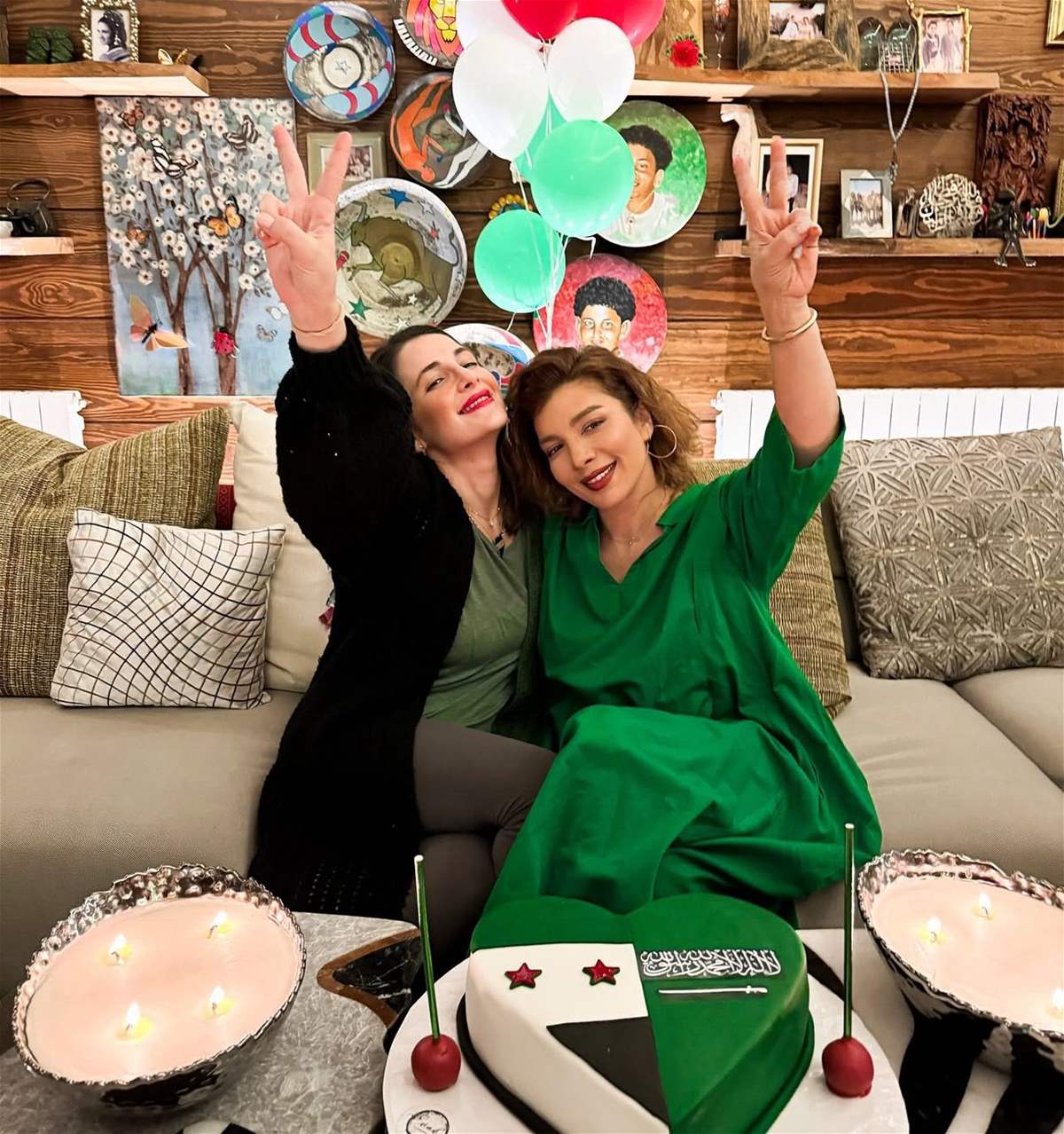 وثّقت شام الذهبي لحظات احتفالها مع والدتها الفنانة أصالة نصري بقالب حلوى مميز على شكل قلب، حمل رمزي العلمين السوري والسعودي وعبارة “سوريا جنة والفرح سوري سعودي”.