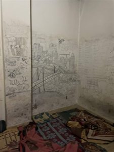 وعلق عليها: “لوحة رسمها أحد المعتقلين السوريين في سجون بشار الأسد، غير معروف إذا كان قد بقي على قيد الحياة”.