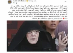 وأضافت: “ظللت أرددها، وأنا احتضن رأسه ويده، وأقول مش حتأخر عليك ياحبيبي. أنت أكرم الرجال لكل من حولك، وربي أكرم منك ياحبيب،ي سيكرمك بعلو كرمك”.