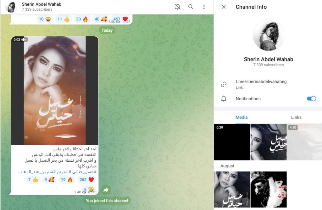 شيرين ناشدت جمهورها عدم تصفح الحسابات القديمة على مواقع التواصل الاجتماعي مؤكدة أنها لا تخضع لسيطرتها، وردت على حذف أغنيتها الخامسة “عسل حياتي” بفتح حساب على التيك توك، وقناة على تليجرام ووعدت بطرح كل أغنياتها من جديد، خاصة وأن شركة روتانا تواصل تقديم البلاغات عن أي مقطع ييتم تداوله بصوت شيرين.